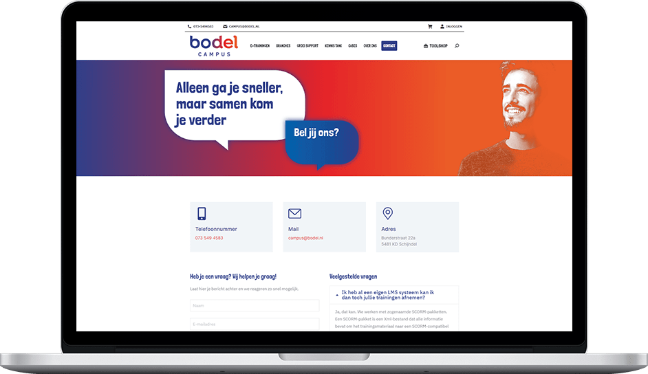 Bij Bodel Campus draait alles om resultaat verbeteren met plezier. Ze zijn gespecialiseerd in het ontwikkelen van e-trainingen. Daarnaast hebben ze Groei Support waarmee ze je ondersteunen met verbetertechnieken om nog meer uit je bedrijf te halen.