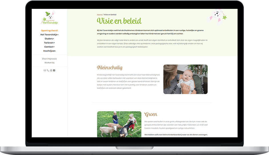 Rianne kwam bij ons met de vraag of we een website voor haar konden ontwikkelen. De nieuwe huisstijl van Kinderdagverblijf Het Toverstokje was ontwikkeld door onze partners van DB Creatieve vormgeving. Het was dus ook vanzelfsprekend dat we de nieuwe huisstijl zouden gebruiken in het ontwerp. Dit ontwerp hebben we daarna vertaald naar een technische goed werkende website. Bezoekers kunnen makkelijk en binnen 2 klikken bij de juiste informatie komen. Tevens kunnen ze via de website hun kind inschrijven of een rondleiding aanvragen.