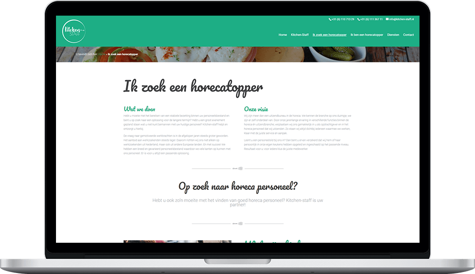 Toen er besloten werd te starten met de nieuwe onderneming “Kitchen Staff” werden wij al vrij snel ingeschakeld. Vanaf de start van de onderneming hebben wij meegedacht om de basis en fundering zo goed mogelijk neer te zetten. Een partner van ons heeft de complete huisstijl van Kitchen Staff ontwikkeld en wij hebben het uiteindelijke design van de website mogen maken.