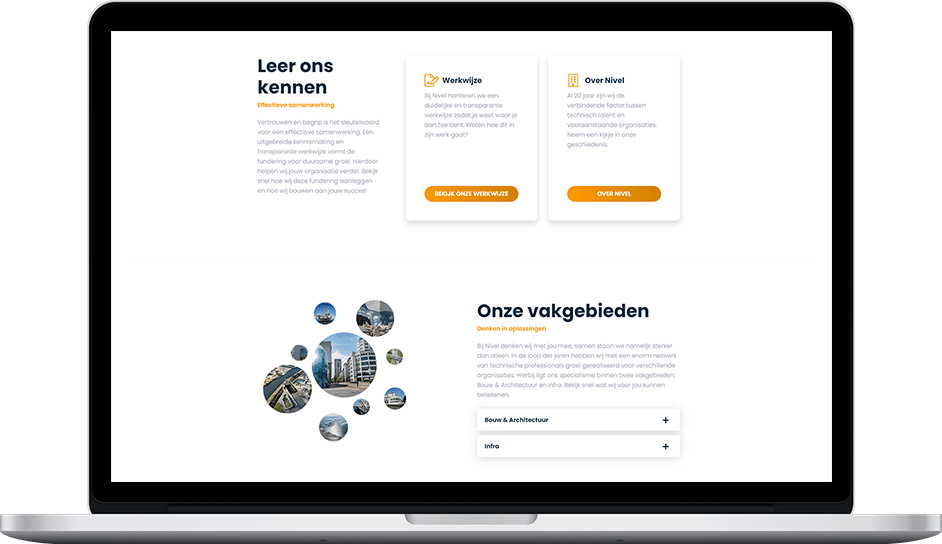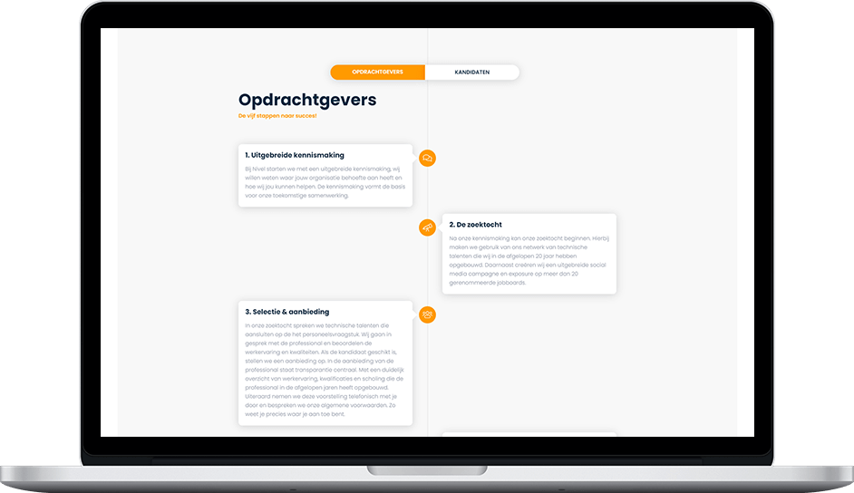 Nivel wilde een nieuwe website waar hun visie, werkwijze en cultuur perfect tot uiting zou komen. We hebben hier meerdere keren voor rond de tafel gezeten om uit te zoeken hoe we dit het beste konden realiseren.